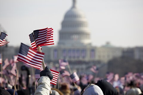 Crowd of people wave small American flags on the National Mall with the US Capitol in the background